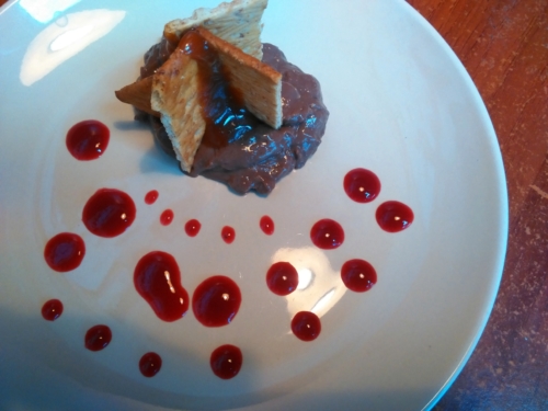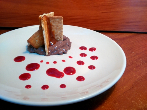 pudín de chocolate • galletas de avena • caramelo • gel de moras